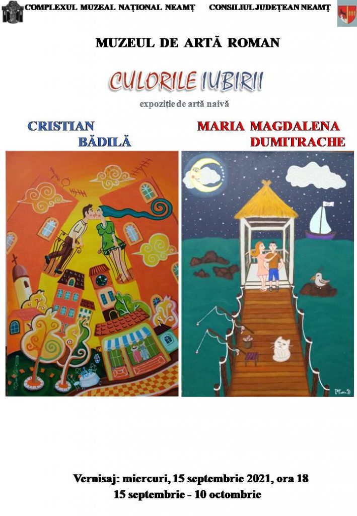 Arta naivă, în peisajul expozițional românesc, este tot mai puternic reprezentată și tot mai mult apreciată, prin manifestările naționale și internaționale. Doi dintre artiștii ale căror lucrări le regăsim tot mai des în aceste expoziții, Cristian Bădilă și Maria Magdalena Dumitrache, ne provoacă să descoperim ”Culorile iubirii”, într-o expoziție armonioasă, explozivă cromatic, strălucitoare și optimistă. O expoziție care bucură și încântă ochiul și sufletul, în care culoarea și spiritul pur, plin de speranță, cuceresc și ne învăluie într-o lume magică, exploratoare, visătoare. Dacă o parte din temele Mariei, coboară în lumea satului, în lumea tradițiilor rurale, a bucuriei pure, a sincerității, a simplității atât de cuceritoare, a viselor de copilărie, regăsim la Cristian o altă lume: cea urbană, nu mai puțin strălucitoare, exploratoare, nu mai puțin încărcată de farmecul inocenței copilăriei, de culoare și bucurie. Maria ne oferă o paletă sensibilă, delicată, grațioasă în atmosfere pure, nostalgice care stârnesc zâmbete și o bucurie copilărească, în lucrări ca: ”Colindătorii”, ”Împodobește mamă bradul”, ”La săniuș”, ”La portiță”, ”Merg pe gard mă țin de drum”…care ne poartă prin lumea satului. Ne invită, zglobiu și misterios, în lumea basmelor, a zânelor și a viselor, într-o lume multicoloră și poetică, cu o eleganță și o ușurință a penelului perceptibile într-o mare de bucurie ce se revarsă ademenitor din pânzele însuflețite, vibrante. O comuniune între om și natură, între tot ce ne înconjoară este tema care domină lucrările celor doi artiști. Pisici, cai, câini, bufnițe, vesele, radiind, însuflețesc lucrările sau chiar sunt personajele principale.