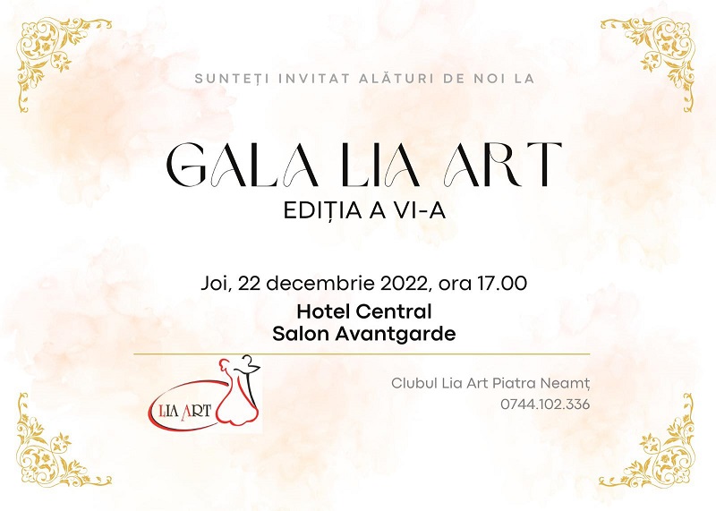 Luna decembrie aduce pentru dansatorii de la Lia Art un nou moment de sărbătoare, toți membrii clubului fiind implicați în organizarea Galei Lia Art- ediția a VI-a. Evenimentul se adresează publicului larg, este sprijinit de Municipiul Piatra Neamț și va avea loc joi, 22 decembrie, orele 17.00 la Sala Avantgarde a Hotelului Central.