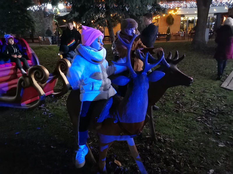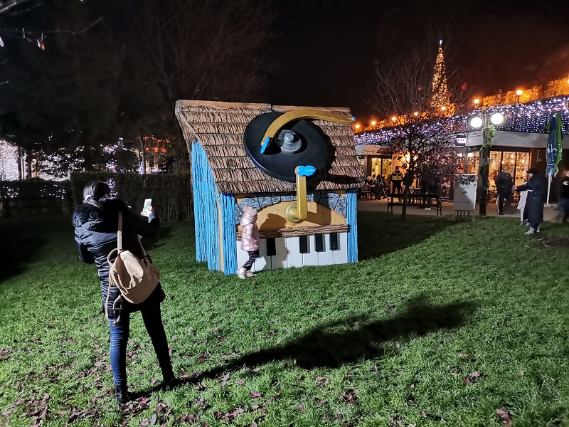Lăudabil, lângă căsuța învelită în beculețe a fost amenajat un loc pentru făcut poze: o sanie cu doi reni (cam instabili) și un Moș Crăciun.