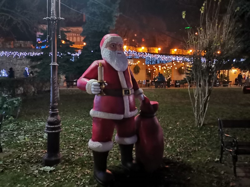 Lăudabil, lângă căsuța învelită în beculețe a fost amenajat un loc pentru făcut poze: o sanie cu doi reni (cam instabili) și un Moș Crăciun.
