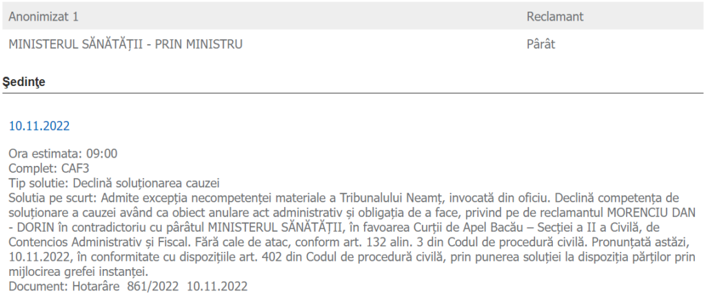 După ce și-a pierdut funcția și șpaga (peste 100.000 de euro – sumă adunată în doar două săptămâni) din cauza anchetei DNA, dr. Dan Dorin Morenciu a decis că a fost înlăturat pe nedrept de la conducerea Serviciului Județean de Ambulanță Neamț. Drept consecință, cu un avocat de încredere (chiar fiica sa) s-a adresat Justiției, dar încă nu a găsit instanța competentă. Dosarul inițial – în care este pârât Ministerul Sănătății, prin ministru – a fost înregistrat pe rolul Tribunalului Neamț, unde numele reclamantului a fost anonimizat la cererea sa, deci nu poate fi găsit decât după număr – 3638/103/2022. La singurul termen de judecată desfășurat la Neamț, pe 10 noiembrie 2022, instanța a constatat, previzibil, că nu are competența materială de a soluționa cauza (tribunalul nu poate judeca miniștri și înalți demnitari, lucru pe care un avocat bun ar trebui să-l știe) și a trimis dosarul la Curtea de Apel Bacău.