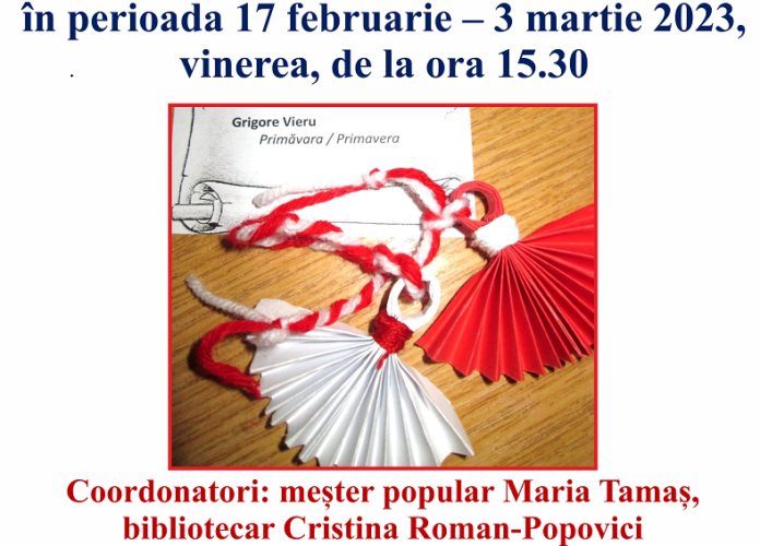 Biblioteca Județeană „G.T. Kirileanu“ Neamț organizează, în perioada 17 februarie – 3 martie 2023, un atelier de mărțișoare și felicitări de primăvară, adresat copiilor și tuturor iubitorilor de tradiții și lectură.