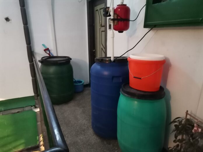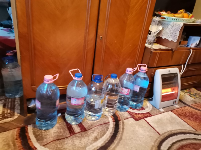 Pe casa scării, lângă apartamentul ei, vecinii țin butoaiele cu apă: ”Mie îmi aduce fratele apă de la Ștefan cel Mare. Am o pompă în butoi, din aia ca la țară, apa intră în centrală și așa pot să fac și eu duș”.