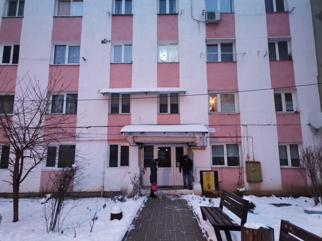 Februarie 2023, blocul B2, scara B, Aleea Tiparului: Locatarii s-au bucurat că a nins. Strâng zăpadă, o topesc și au un pic de apă pentru baie. Și pentru pus în veceuri. Pe casa scării e deja un miros greu. Nimeni nu mai are apă din luna iunie a anului trecut. Într-o garsonieră de 18 mp de la etajul 4, locuiesc soții Ciochină – unii dintre ”marii datornici” de pe scară. Bărbatul are handicap de gradul I. Stă pe marginea patului și se încălzește la un radiator, folosit cu economie – doar o rezistență funcționează. E scump curentul.