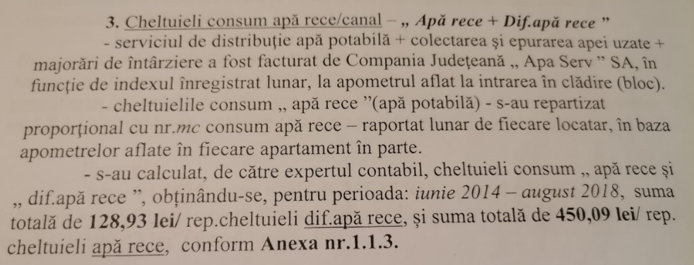 În protocolul semnat, la data de 28 noiembrie 2012, între Bogdan Florea, administratorul asociației ”mamă” și Petronela Gavriloaia, președintele nou-înființatei Asociații de proprietari Tiparului nr. 3, Bloc b2, scara B. figurează un debit către Apa Serv de 129.542,63 lei. Cum și de unde rezultă e dificil să stabilească cineva în condițiile în care biroul domnului Bogdan a ars cu tot cu acte, iar acele fișe ale proprietarilor scrise după 30 de ani, sunt negate de locatari. Mai interesant este un alt aspect. Familia Ciochină a fost dată în judecată de Locativ pentru neplata întreținerii între anii 2014 și 2019, într-o perioadă în care se presupune că asociația ar fi trebuit să funcționeze corect, indiferent de debitul istoric nelămurit nici acum. Și expertiza contabilă stabilește nu doar că datoria nu era cea din fișă, ci și faptul că soții Ciochină au plătit mai mult cu aproape 3.000 de lei.