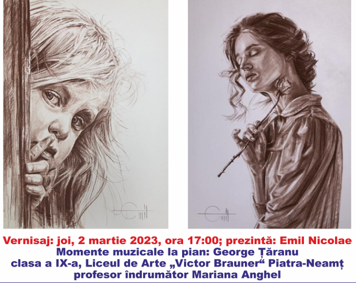 Vernisajul va avea loc joi, 2 martie, de la ora 17:00, iar prezentarea va fi făcută de Emil Nicolae. Evenimentul va fi presărat cu momente muzicale la pian, susținute de George Țăranu, elev în clasa a IX-a la Liceul de Arte „Victor Brauner“ Piatra-Neamț, care o are ca profesoară îndrumătoare pe Mariana Anghel. Acesta va interpreta Preludiu și Fuga nr. 14 de J.S. Bach și Balada nr. 3 de Fr. Chopin.