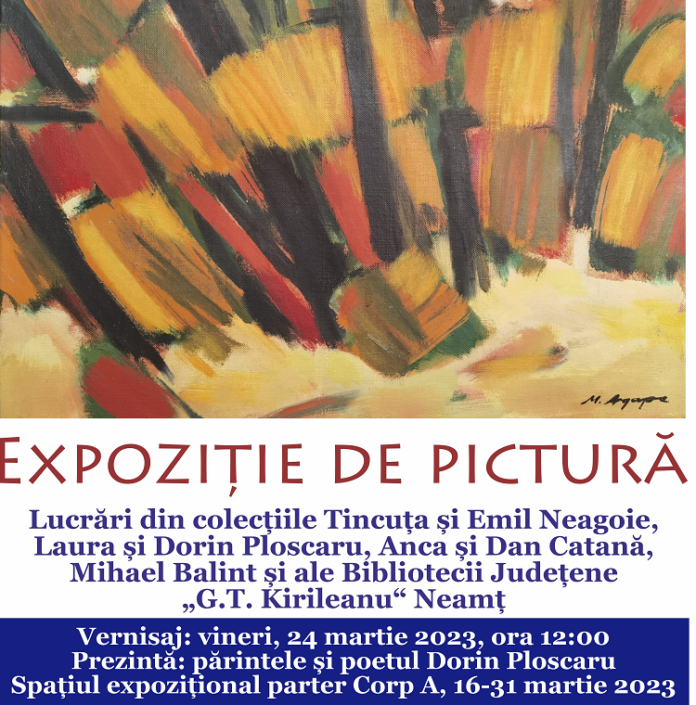 Biblioteca Județeană „G.T. Kirileanu“ Neamț, în parteneriat cu Asociația R.A.D.A,  organizează expoziția de pictură „Mihai Agape – 85, în spațiul expozițional de la parterul corpului A, în perioada 16-31 martie 2023. Lucrările provin din colecțiile Tincuța și Emil Neagoe, Laura și Dorin Ploscaru, Anca și Dan Catană, Mihael Balint și ale Bibliotecii Județene „G.T. Kirileanu“ Neamț.