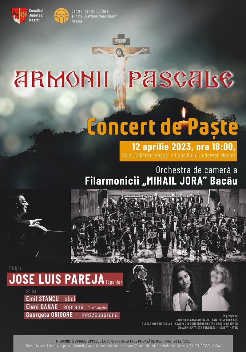În cadrul proiectului Armonii pascale, Centrul pentru Cultură și Arte „Carmen Saeculare” Neamț invită publicul meloman să participe la Concertul extraordinar de Paște, pregătit în colaborare cu Filarmonica „Mihail Jora” din Bacău. Alături de Orchestra de cameră a filarmonicii, sub bagheta dirijorului spaniol Jose Luis Pareja, vor evolua , în calitate de soliști, oboistul Emil Stancu, mezzosoprana engleză de origine greacă Eleni Danae și mezzosoprana română Georgeta Grigore. Programul muzical anunțat cuprinde Arie pe coarda sol (Johann Sebastian Bach), Adagio din Concertul pentru oboi în re minor (Allesandro Marcello) și Stabat mater (Giovanni Battista Pergolesi).