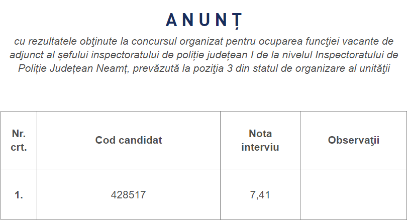 După ce-a ratat concursul pentru funcția de inspector șef al Poliției Neamț (cu o notă onorabilă totuși, dacă ne uităm pe site-ul Poliției Române, unde sunt inclusiv respinși cu nota 1), comisarul șef Mihai Osoianu s-a înscris la concursul pentru funcția de adjunct. Interviul a avut loc astăzi, 7 aprilie, iar candidatul a reușit să treacă de pragul obligatoriu și a obținut nota 7,41.