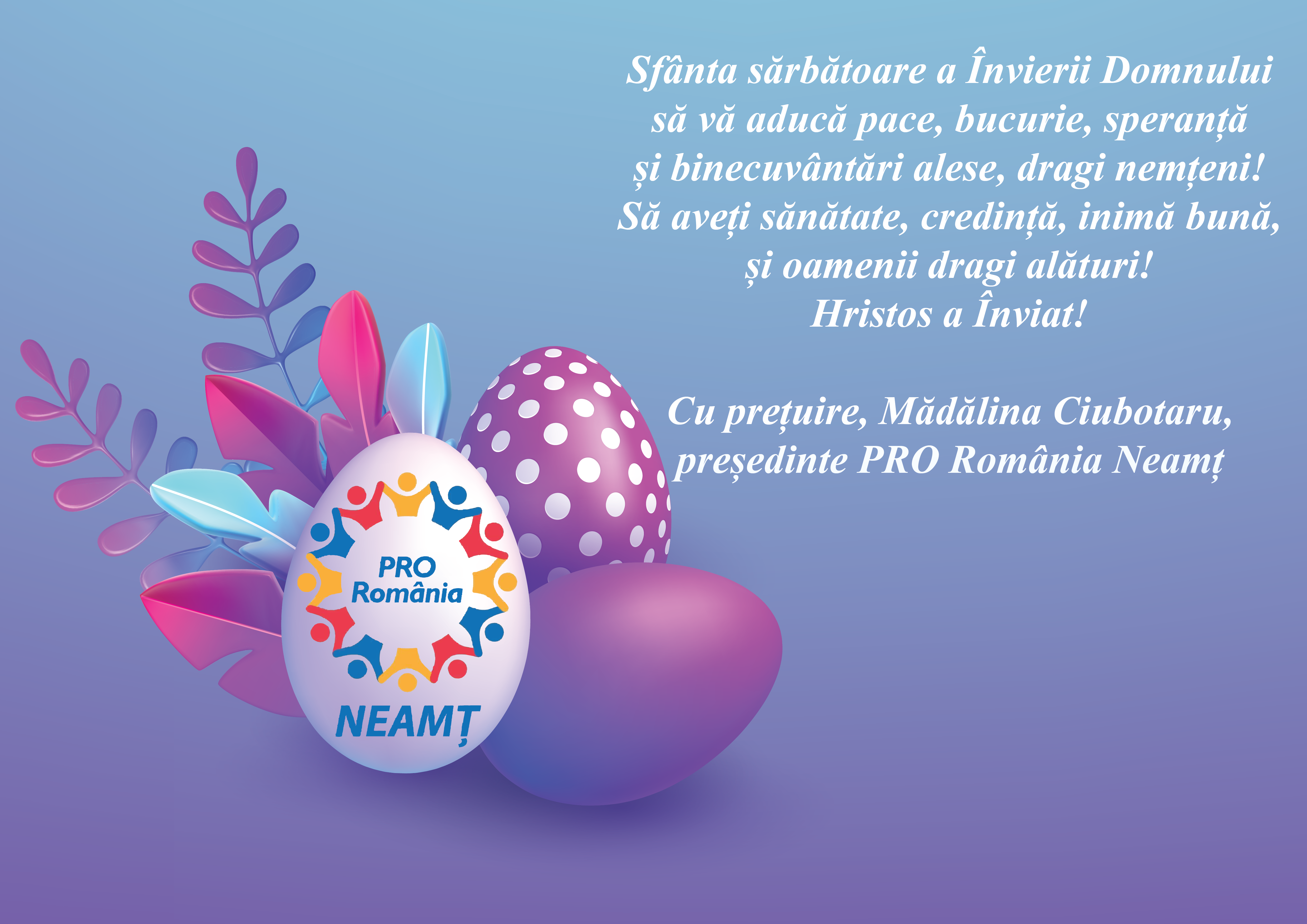 Felicitări de Sărbători Mădălina Ciubotaru – PRO România Neamț De către AtitudineadeNeamț - 15/04/2023 0 FacebookTwitterPinterestWhatsApp Post Views: 56