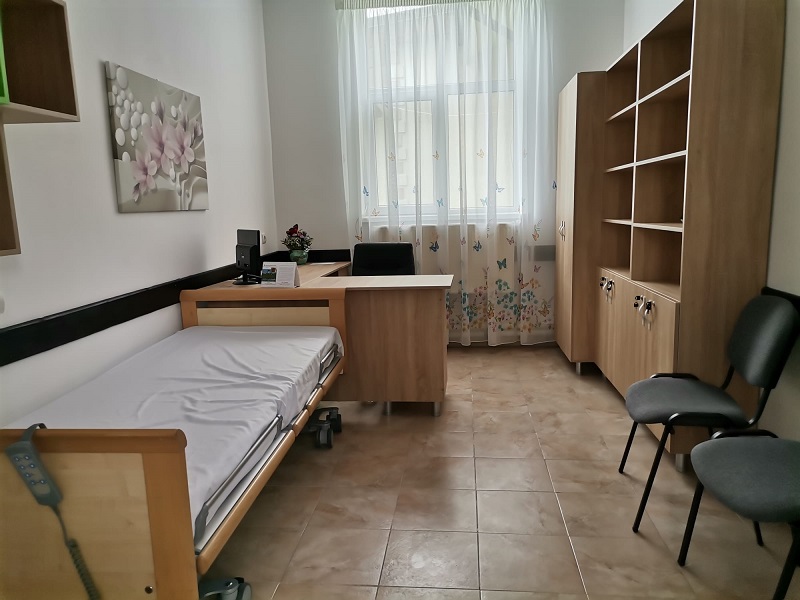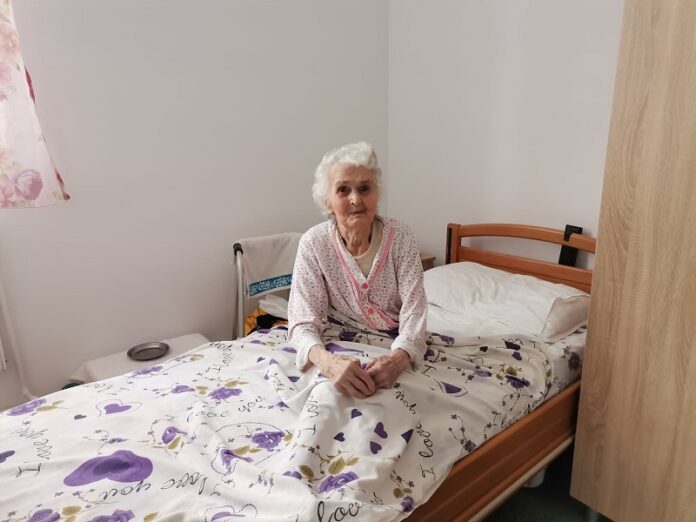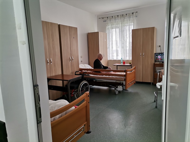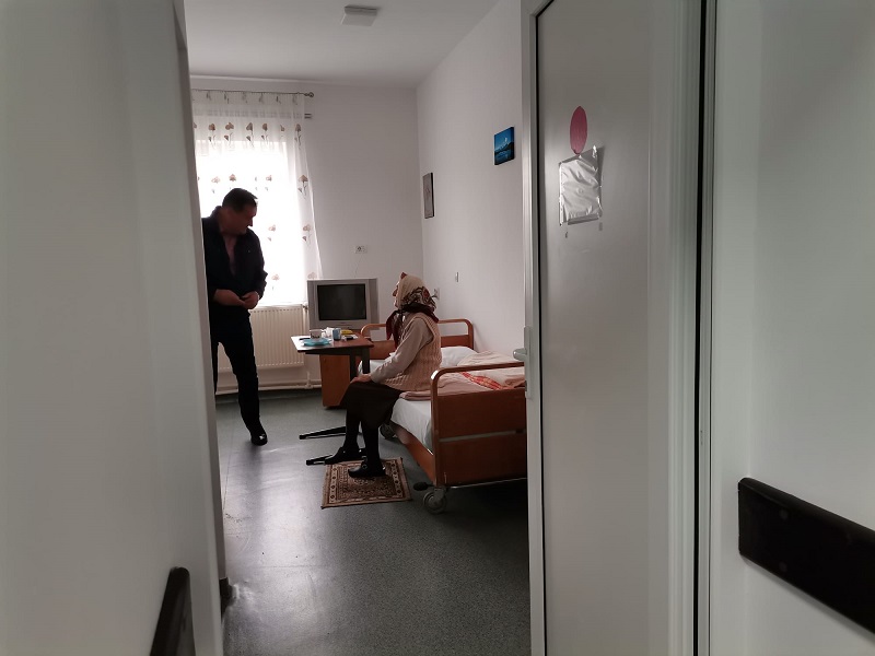 În unul din cele 21 de saloane am găsit-o pe doamna Maria, o bătrânică de 95 de ani, care se bucură ori de câte ori vede pe cineva intrând la ea în cameră. Are trăsături frumoase și ochi luminoși, își pierde memoria și-și dă seama de asta, dar nu uită în nicio zi să-i pomenească pe fiul și pe soțul ei: ”Nu mai știu în ce zi din săptămână suntem, în ce lună. Întreb. Bine că știu cum mă cheamă. Îs amărâtă. Mi-a murit băiatul la 26 de ani, săracul. Și bărbatul, la 6 luni după ce-a ieșit la pensie, la 60 de ani, s-a dus și el. Și am rămas singură. Am o fată, bună fată, dar ea e la București. Am 10 ani de când am venit aici. Acuma e frumos, ne-a făcut curat, ne-a schimbat paturile, ne-a dat șifonier nou la toți, nu numai la noi în cameră. Puteți să deschideți, să vedeți cum am aranjate lucrurile”.Pe hol, am întâlnit-o pe doamna Monica – cea mai veche angajată a căminului: ”Am lucrat și pe vremea când era spital, deci am 15 ani de când sunt aici, am prins toate etapele. Acum e foarte frumos. Ne bucurăm și noi și beneficiarii că totul arată schimbat și nou. Când vezi o perdea, un tablou, faci un pic de cromoterapie, nu? Când vezi curățenie, te simți altfel!”.