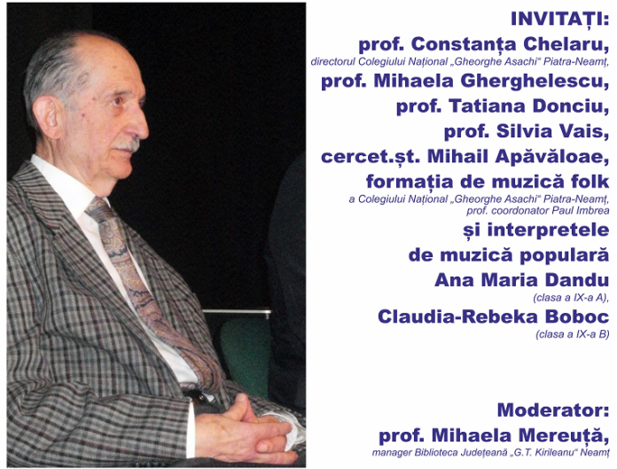 Invitații manifestării sunt prof. Constanța Chelaru, directorul Colegiului Național „Gheorghe Asachi“ Piatra-Neamț, prof. Mihaela Gherghelescu, prof. Tatiana Donciu, prof. Silvia Vais, cercet.șt. Mihail Apăvăloae, formația de muzică folk a Colegiului Național „Gheorghe Asachi“ Piatra-Neamț, prof. coordonator Paul Imbrea și interpretele de muzică populară Ana Maria Dandu (clasa a IX-a A), Claudia-Rebeka Boboc (clasa a IX-a B). Evenimentul are loc în cadrul proiectului „Să cunoaștem istoria județului prin memoria comunității. Oameni, locuri, fapte“. Întâlnirea va fi moderată de prof. Mihaela Mereuță, managerul Bibliotecii Județene „G.T. Kirileanu“ Neamț.