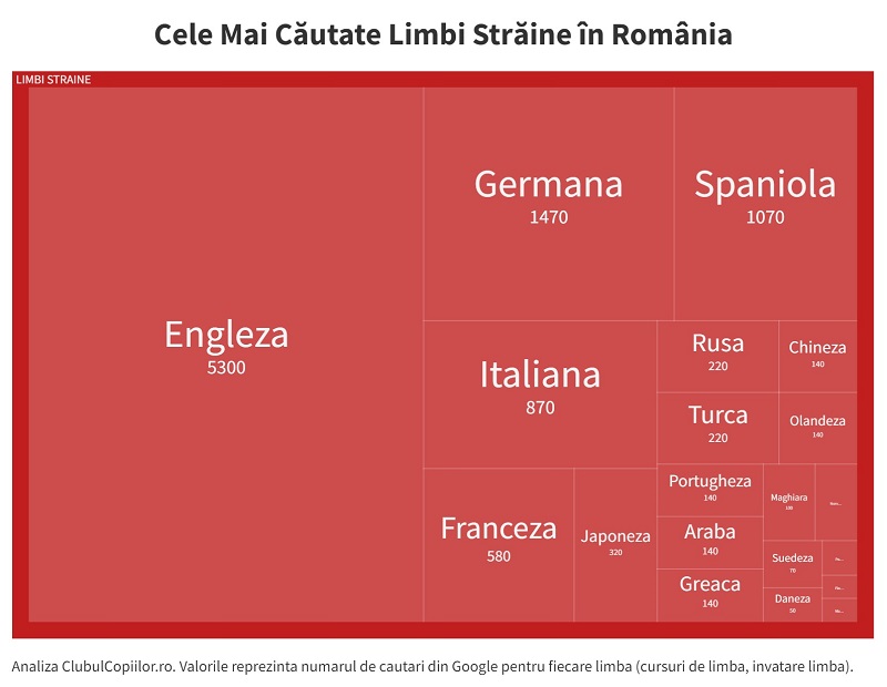 ClubulCopiilor.ro a făcut o analiză a datelor pe care le oferă Google, cel mai popular motor de căutare din România, pentru a determina cele mai căutate limbi străine în România. Mai precis am analizat volumul de căutări în Google pentru cuvinte cheie ca “învață englezăînvață francezăcursuri engleză, etc.” din ultimele 12 luni.