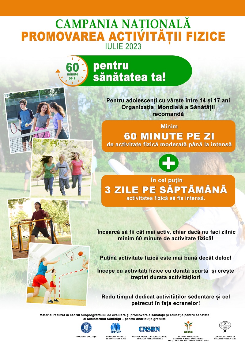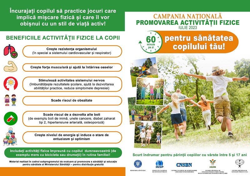 Direcţia de Sănătate Publică a județului Neamț organizează în luna iulie 2023 Campania națională „Promovarea activității fizice”. Populația țintă căreia i se adresează campania este reprezentată de copii și adolescenți cu vârste cuprinse între 5 și 17 ani și părinții acestora.