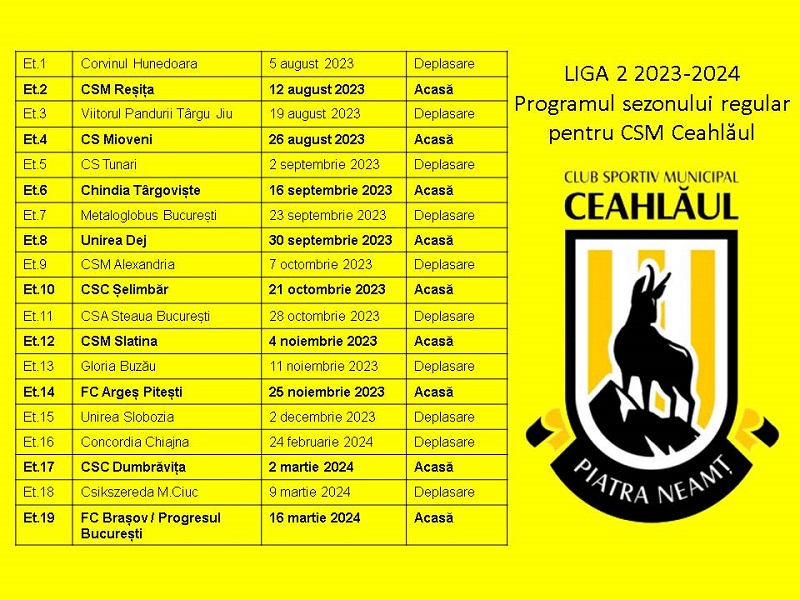 Sorții au decis: în primul meci din campionat echipa Ceahlăul va avea drept adversar tot o formație nou-promovată în Liga 2 – Corvinul Hunedoara. Date fiind circumstanțele, este de așteptat o confruntare în care fiecare fotbalist să fie concentrat și să dea tot ce poate pe teren. Meciul se va juca în deplasare.