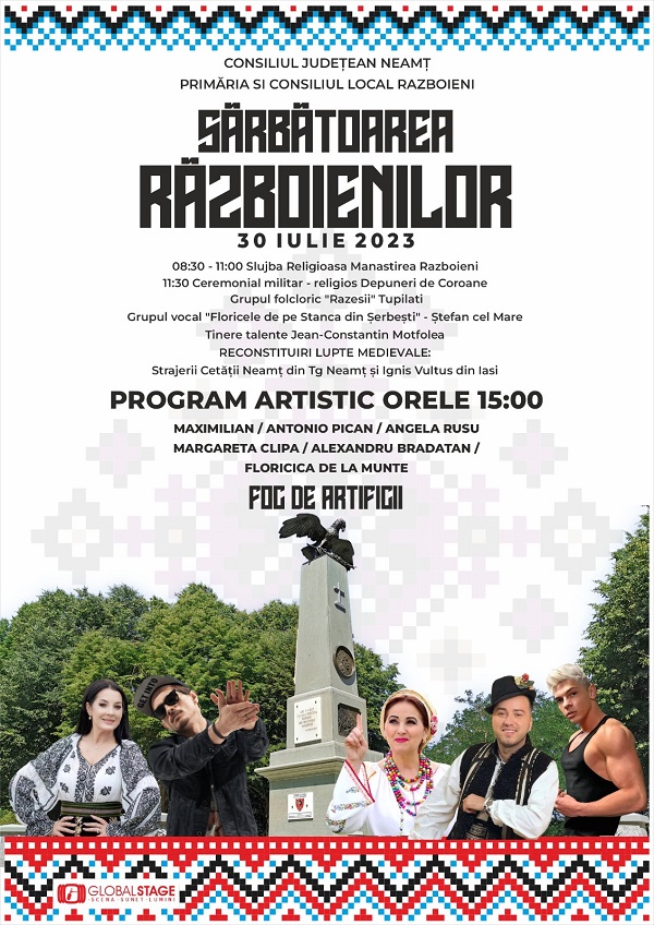 Sărbătoarea Războienilor – unica sărbătoare din mediul rural, cu ceremonial militar și defilarea Armatei Române – a ajuns, anul acesta, la ediția cu numărul 55. Duminică, 30 iulie, comunitatea se va aduna de dimineață la Mănăstirea Războieni, pentru a asista la slujbă, urmând ca (la ora 11,30) la Monumentul Eroilor căzuți în lupta de la Valea Albă să aibă loc ceremonialul militar-religios și depunerile de coroane. Anul acesta, sunt invitați să susțină un program artistic Grupul folcloric ”Răzeșii” Tupilați, Grupul vocal ”Floricele de pe Stânca din Șerbești” Ștefan cel Mare și Jean-Constantin Motfolea.