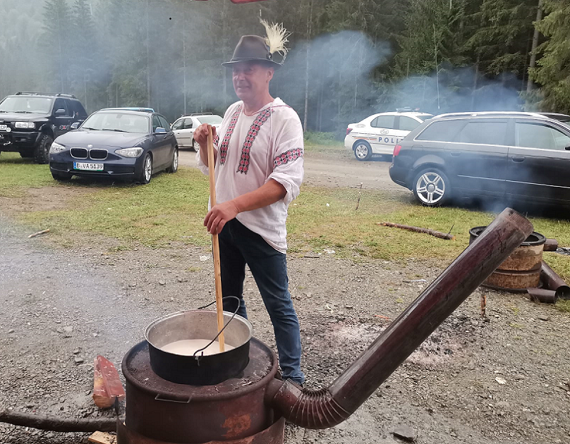 Și dacă tot avea ”agregatul” în funcțiune, Viorel a oferit o demonstrație rapidă de făcut un balmuș extrem de gustos. A încălzit ceaunul, a turnat în el vreo 4 sticle de jântuit (produsul care rezultă după scoaterea cașului dulce din lapte), urmează mălaiul, ceva urdă și neapărat un pic de unt de oaie, dacă jântuitul e prea slab. ”Trebuie amestecat foarte ușor, să nu se facă deloc cocoloașe de făină, secretul unui balmuș reușit e amestecatul continuu și ordinea în care se pun ingredientele – fiecare la timp. Brânza trebuie frământată foarte mărunt și mare atenție – să nu se prindă de ceaun. Altfel e problemă, nu mai are același gust. Și oamenii de la munte, obișnuiți să mănânce natural și bun, nu te mai apreciază”.