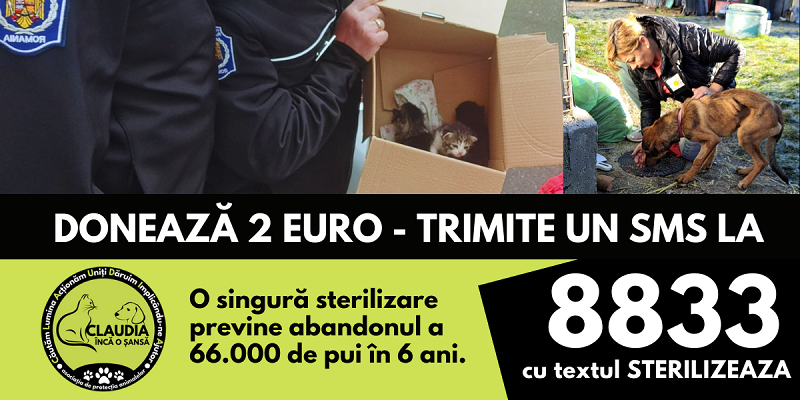 Poți dona 2 euro, printr-un SMS la 8833, până pe 15 noiembrie. Sprijină și tu campaniile de sterilizări gratuite din Neamț!