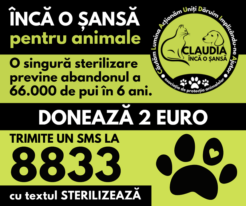 Asociația „CLAUDIA Încă o șansă”, CIF 43670519, este o organizatie non-profit, cu sediul în Piatra-Neamț, cu rază de activitate pe întreg județul Neamț. Încă de la înființare, din 2021 până în prezent, am realizat peste 3100 de sterilizări gratuite pentru câini și pisici, din fonduri proprii. Dorim ca în anul 2023 să reușim să realizăm încă 1500 de sterilizări gratuite pentru a reduce fenomenul abandonului și al animalelor fără stăpân din județul Neamț. Campaniile de sterilizări sunt o alternativă etică a practicii eutanasiei din adăposturile publice, oferind o soluție umană și demnă atât pentru animale, cât și pentru oameni. Facem un apel către toți cei care consideră că sterilizarea este singura soluție umană de a combate fenomenul animalelor hoinare să ne susțină în acest demers prin campania de donație prin SMS. O singură sterilizare poate preveni abandonul a 66.000 de pui în 6 ani. Întreaga noastră activitate este transparentă și disponibilă pe facebook, pe pagina Încă o șansă, dar și pe website www.claudiaincaosansa.ro. Vă mulțumim!