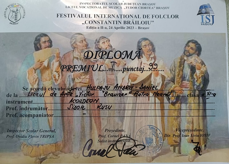 Iar Andrei este un acordeonist foarte bun. A participat în fiecare an la câte 5-6 concursuri și niciodată nu s-a clasat mai jos de locul II. De exemplu la Festivalul Internațional de Folclor Constantin Brăiloiu, de la Brașov, a luat locul I. Doar la olimpiadă a obținut locul III, dar a fost o competiție națională, la care au participat copii de excepție.