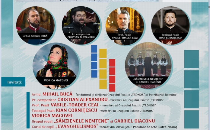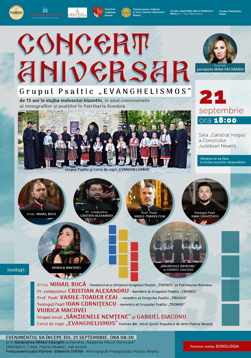 Joi, 21 septembrie 2023, la sala „Calistrat Hogaș” a Consiliului Județean Neamț, începând cu ora 18:00, grupul psaltic „Evanghelismos” invită publicul iubitor meloman la concertul aniversar prin care sunt sărbătoriți cincisprezece ani în slujba melosului bizantin, în anul comemorativ al imnografilor și psalților în Patriarhia Română.