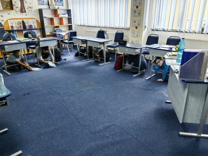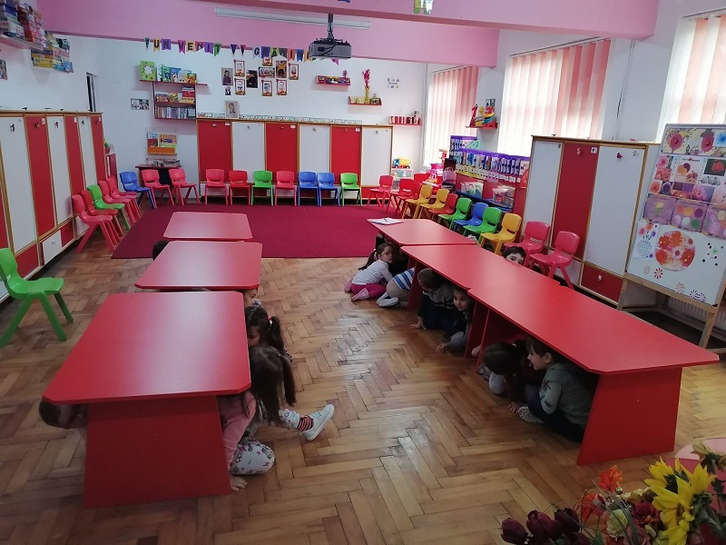 • adăpostirea copiilor sub bancă, masă, grindă sau tocul de la ușă. În cazul în care sunt persoane ce au fost surprinse pe hol, se recomandă ca acestea să se așeze în poziția ghemuit cu mâinile deasupra capului lângă peretele interior, îndepărtându-se de ferestre