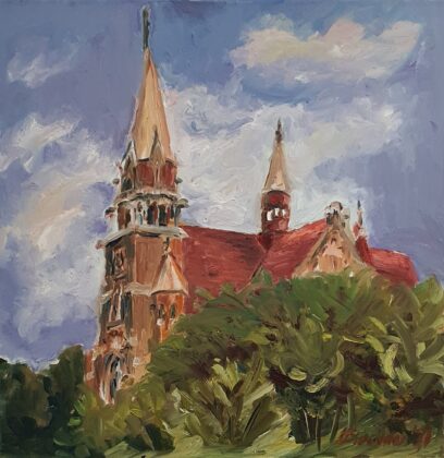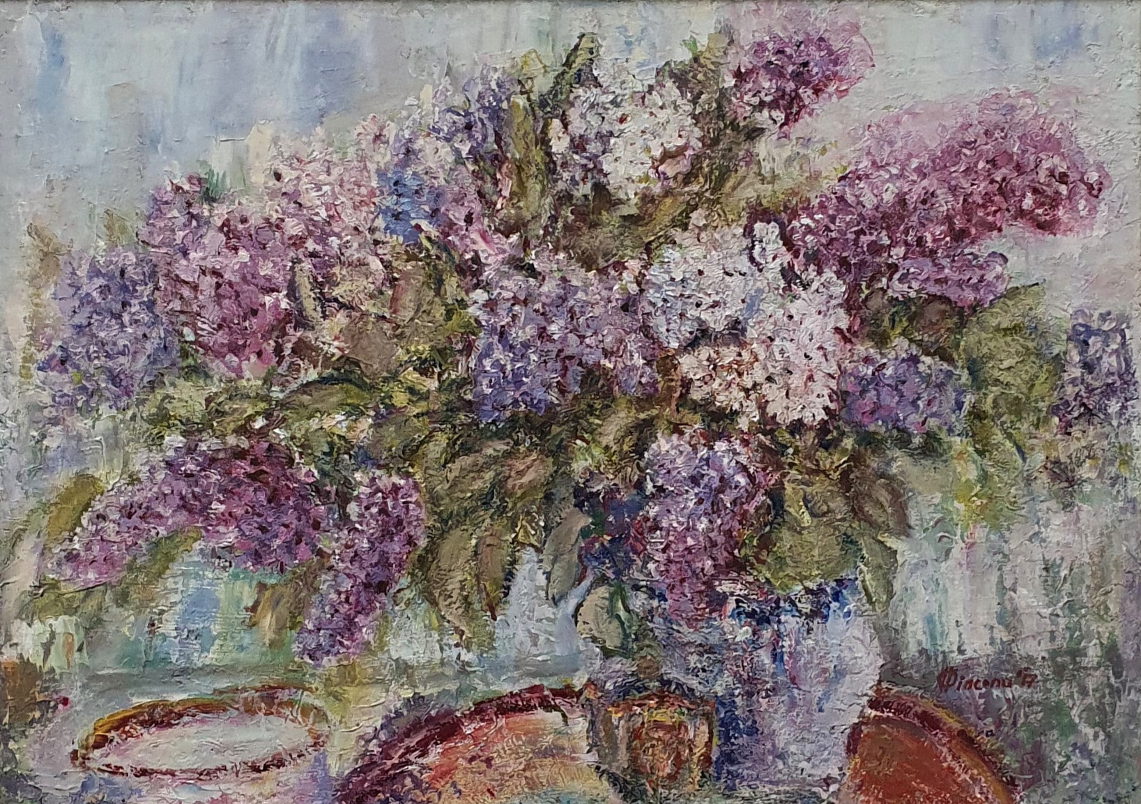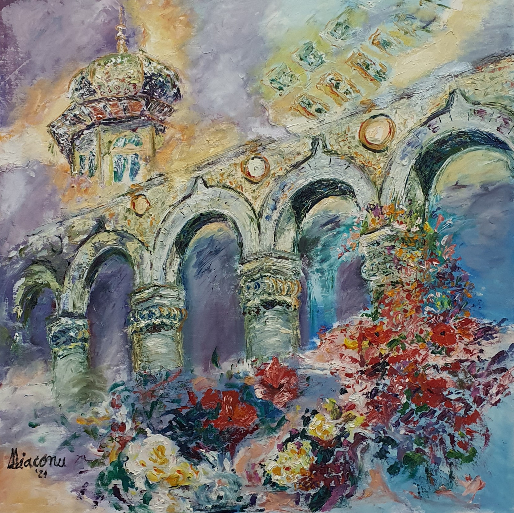 Expoziția de pictură semnată Doina Diaconu, cu titlul evocator ”Ferestre spre cer”, prezintă pe simeze 39 lucrări de pictură în ulei. Zăbovind în fața lucrărilor de pictură ale Doinei Diaconu ne atrag atenția cele trei dimensiuni asupra cărora se oprește: tematica religioasă, tema naturii statice și tema venețiană. Un conținut sensibil, sub semnul sacrului, al naturii și al picturalei Veneții, caracteristic fiind sentimentul tradiției și al spiritualității. Lucrările cu temă religioasă, dominante în expoziție, aflate la granița dintre artă și religie, ne oferă un moment de liniște și pace, de interiorizare și înfiorare în fața monumentalelor interioare de biserică sau de reculegere în fața catapetesmelor sau a unei Sucevițe strălucitoare și impunătoare. Sunt viziuni proprii, palete de sensibilitate și trăire profund spirituală, surprinzând armonia și delicatețea cromatică a pânzelor de mari dimensiuni. Surprinde clipa și eternitatea, viața și moartea într-un discurs cromatic elegant, proaspăt, delicat într-o atmosferă plină de farmec, duioasă. Auriul, culoarea veșniciei, măreției, a desăvârșirii, îl regăsim în catapetesme, ”icoana tuturor icoanelor”, hotarul dintre lumi, cea trecătoare, pământească, și cea veșnică, în ceruri, în interioare de biserici sau la ușile împărătești. Albastrul-verzui, simbol al Duhului Sfânt, împodobește interioarele într-n mod armonios, pentru a se opri la calmul și profundul albastru, sugerând transparența și dematerializarea, contemplația și echilibrul. Și peste toate lumina, învăluitoare, caldă, înălțătoare ca o rugă. Armonie și echilibru, sobrietate, eleganță, spațialitate și expansiune sub un penel care cucerește prin prospețime și sensibilitate. Doina pictează cu sufletul în revărsări de trăiri interioare ce devin mărturisiri de culoare, în emoția penelului. Nuanțele se îmbrățișează, se îngemănează, devin mângâietoare și spirituale. Un dialog între ”aici” și ”dincolo” sub semnul unei intimități sacre, cu o profunzime de rugă într-o coregrafie cromatică și spațială care ne invită la contemplare.