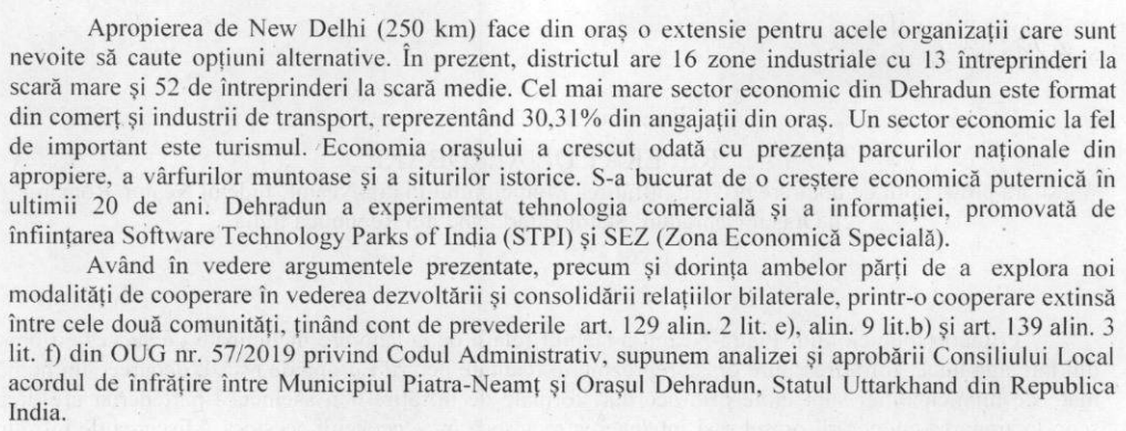 În referatul de aprobare se precizează că, în anul 2021, ambasadorul Indiei în România, Excelența Sa domnul Rahul Shrivastvasa  a vizitat Piatra-Neamț ”în contextul unui interes crescut din partea companiilor indiene pentru investiții în România și inclusiv în Piatra-Neamț, dar și oportunitatea unor schimburi de experiență”.
