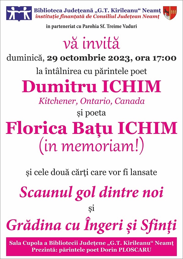 Biblioteca Județeană „G.T. Kirileanu“ Neamț, în parteneriat cu Parohia Sf. Treime Vaduri, organizează întâlnirea cu părintele poet Dumitru Ichim – din Kitchener, Ontario, Canada –, cu Florica Bațu Ichim (in memoriam) și cu două cărți care vor fi lansate: „Scaunul gol dintre noi“ (Editura Eikon București, 2023) și „Grădina cu Îngeri și Sfinți“ (Editura Vremi). Evenimentul va avea loc duminică, 29 octombrie 2023, de la ora 17:00, în Sala Cupola, iar prezentarea va fi făcută de părintele poet Dumitru Ploscaru.