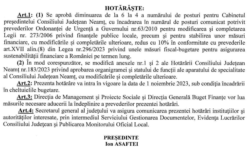 Consilierii județeni au votat, fără excepție, diminuarea numărului de posturi de la Cabinetului președintelui, în ședința din după amiaza de 30 octombrie. Proiectul a fost introdus suplimentar pe ordinea de zi, determinat de apariția ”Legii privind unele măsuri fiscal-bugetare pentru asigurarea sustenabilității financiare a României pe termen lung”. Aceeași lege a fost motivul retragerii proiectului ”privind aprobarea unei asocieri cu Federația Română de Box”, care ar fi implicat finanțarea Finalei Campionatului Național de Box pentru Cadeți cu 30.000 de lei.