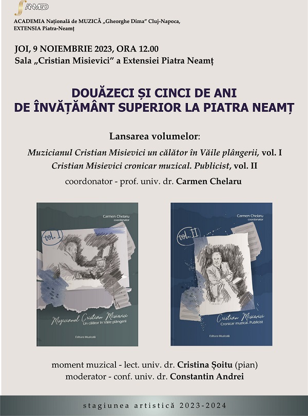 Joi, 9 noiembrie 2023, Academia Națională de Muzică „Gheorghe Dima” Cluj-Napoca, Extensia Piatra Neamț, sărbătorește 25 de ani de la înființare. Evenimentul moderat de directorul instituției, conf. univ. dr. Constantin Andrei, va fi marcat de lansarea a două volume despre cel care a pus bazele facultății în anul 1998, profesorul universitar doctor Cristian Misievici (11 noiembrie 1953-25 august 2020). Autoarea celor două volume intitulate „Muzicianul Cristian Misievici un călător în Văile plângerii” (vol. 1) și „Cristian Misievici cronicar muzical. Publicist” (vol. 2), este sora domniei sale, profesor universitar doctor Carmen Chelaru de la Universitatea Națională de Arte „George Enescu” din Iași.