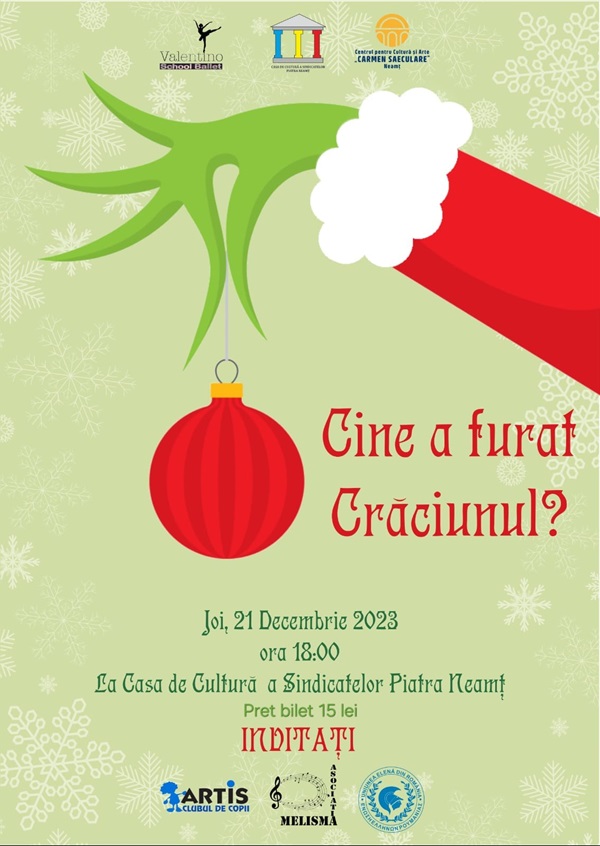 Casa de Cultură a Sindicatelor Piatra-Neamț, în parteneriat cu Centrul pentru Cultură și Arte „Carmen Saeculare”, va prezenta spectacolul intitulat „Cine a furat Crăciunul?”. Vor evolua ansamblul vocal al Asociației „Melisma” (coordonator, Maria Țifrea), grupul „Artis” și ansamblul „Niki” al Comunității Elene Piatra-Neamț