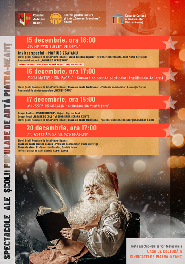 Evenimentul va avea loc joi, 21 decembrie 2023ora 18:00, la sala de spectacole a Casei de Cultură a Sindicatelor Piatra-Neamț.