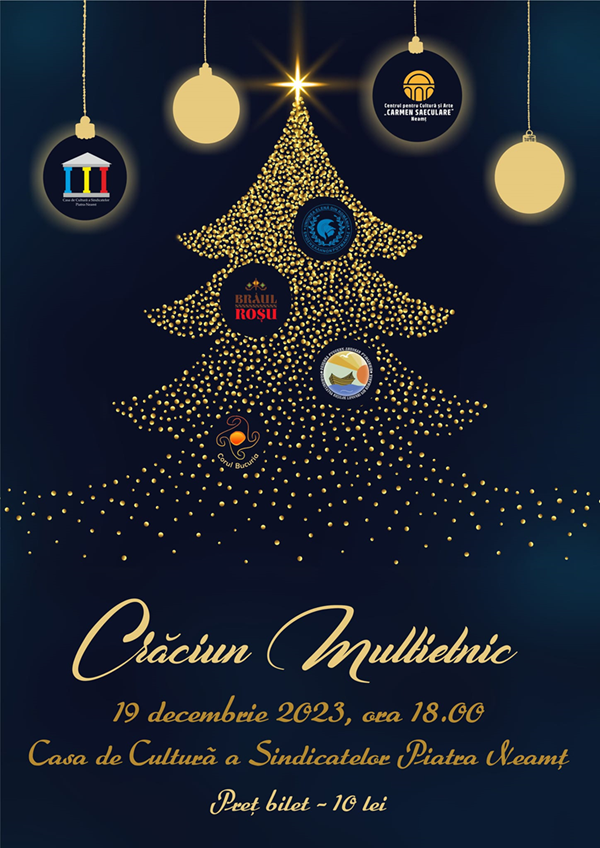 Casa de Cultură a Sindicatelor Piatra-Neamț, în parteneriat cu Centrul pentru Cultură și Arte „Carmen Saeculare”, organizează spectacolul intitulat „Crăciun multietnic”. Vor evolua Ansamblul Folcloric „Brâul Roșu”; Corul „Bucuria” (coordonator, Elena Șulea); ansamblurile „Niki” ale Comunității Elene Piatra-Neamț, „Steluțe Vesele”, „Trandafirașii” și „Margarete” ale Comunităților Rușilor Lipoveni din Piatra-Neamț.