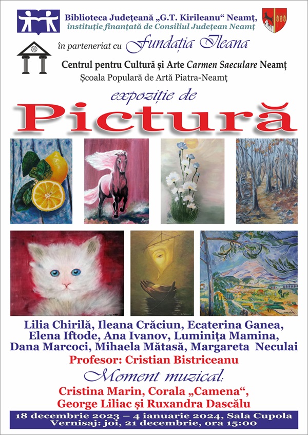 Biblioteca Județeană „G.T. Kirileanu“ Neamț, în parteneriat cu Fundația Ileana și Centrul pentru Cultură și Arte „Carmen Saeculare“ Neamț, organizează o nouă expoziție colectivă de pictură, care va fi găzduită în Sala Cupola, în perioada 18 decembrie 2023 – 4 ianuarie 2024.