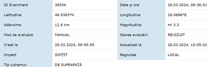 Conform Institutului Național de Cercetare-Dezvoltare pentru Fizica Pământului, în această dimineață (28 martie) s-a produs un cutremur cu magnitudinea de 3,3 în județul Neamț.
