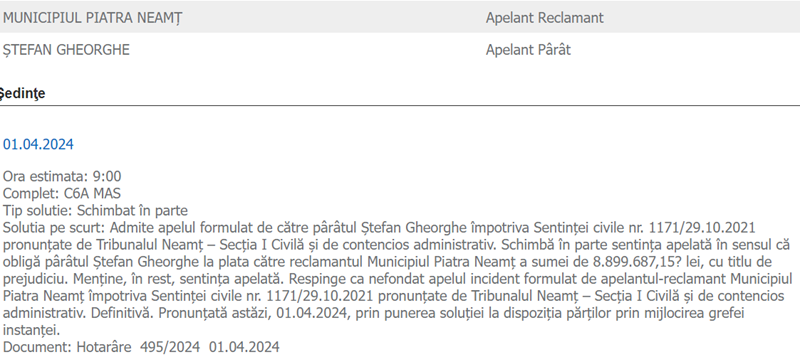 Astăzi, 1 aprilie, Curtea de Apel Brașov a pronunțat hotărârea definitivă în dosarul în care fostul primar de Piatra-Neamț a fost judecat pentru prejudiciul produs primăriei, iar instanța a decis că trebuie să aducă de acasă aproape 1,8 milioane de euro: ”Schimbă în parte sentinţa apelată în sensul că obligă pârâtul Ştefan Gheorghe la plata către reclamantul Municipiul Piatra Neamţ a sumei de 8.899.687,15 lei, cu titlu de prejudiciu. Menţine, în rest, sentinţa apelată. (…) Definitivă. Pronunţată astăzi, 01.04.2024, prin punerea soluţiei la dispoziţia părţilor prin mijlocirea grefei instanţei”.