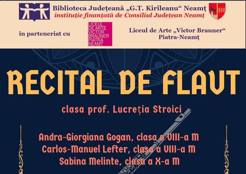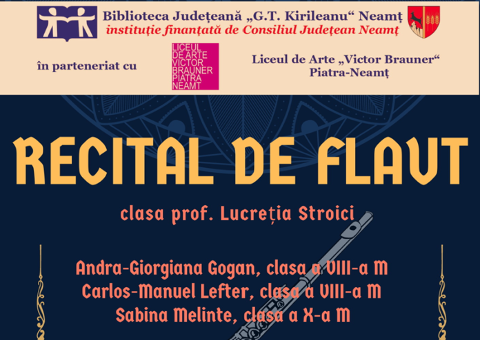 Biblioteca Județeană „G.T. Kirileanu“ Neamț găzduiește Recitalul Clasei de Flaut a profesoarei Lucreția Stroici, marți, 14 mai 2024, de la ora 17:00, în Sala Cupola. Evenimentul, care are loc în cadrul proiectului cultural Simfonii Cromatice, este desfășurat în parteneriat cu Liceul de Arte „Victor Brauner“ Piatra-Neamț și își propune să ofere publicului o incursiune subtilă și emoționantă în lumea rafinată a muzicii clasice.