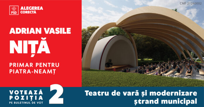 Construcția unui amfiteatru pentru evenimente artistice și culturale. Asta își propune să facă Adrian Niță, candidatul PSD la primăria municipiului Piatra-Neamț. “Ne dorim să creăm un spațiu contemporan, accesibil tuturor vârstelor, care să îmbine relaxarea, activitățile recreative și cele culturale și educaționale. Astfel, vrem să redefinim experiența comunitară și să punem în valoare patrimoniul și potențialul creativ al frumoasei comunități din Piatra Neamț,” a declarat Adrian Niță.