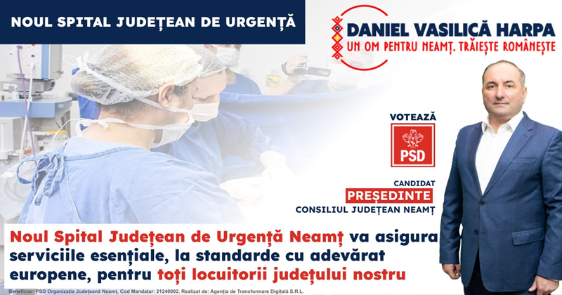 ”În ciuda tuturor comentariilor celor care nici nu fac și nici nu tac, REALIZĂM această investiție majoră, în următorii ani: un spital județean de urgență nou în Neamț. Istoria recentă a acesteia nu poate fi schimbată: sub conducerea PSD, Consiliul Județean a obținut finanțarea pentru un spital județean NOU și se ocupă de pregătirea terenului pe care se va realiza construcția”, a declarat Daniel Vasilică Harpa, candidatul PSD la funcția de președinte al Consiliului Județean Neamț.
