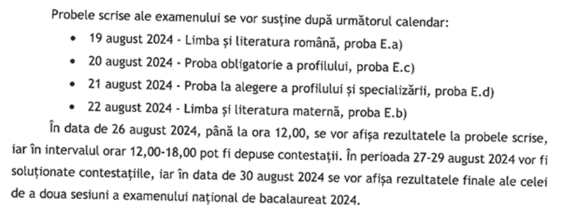 Inspectoratul Școlar Județean Neamț informează că înscrierea candidaților la a doua sesiune de examen, inclusiv a celor care au promovat examenele de corigențe, are loc în perioada 15-22 iulie. Evaluarea competențelor lingvistice și digitale se va realiza în perioada 8-14 august. Probele scrise se vor desfășura între 19 și 22 august.