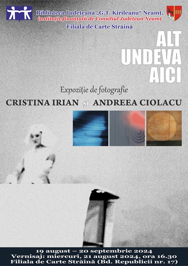 Biblioteca Județeană „G.T. Kirileanu“ Neamț găzduiește expoziția de fotografie Alt.Undeva.Aici, realizată de artiștii Cristina Irian și Andreea Ciolacu, în perioada 19 august – 20 septembrie 2024, în vitrinele Filialei de Carte Străină. Vernisajul expoziției va avea loc miercuri, 21 august 2024, la ora 16.30, la sediul filialei, Bulevardul Republicii nr. 17, Piatra-Neamț.