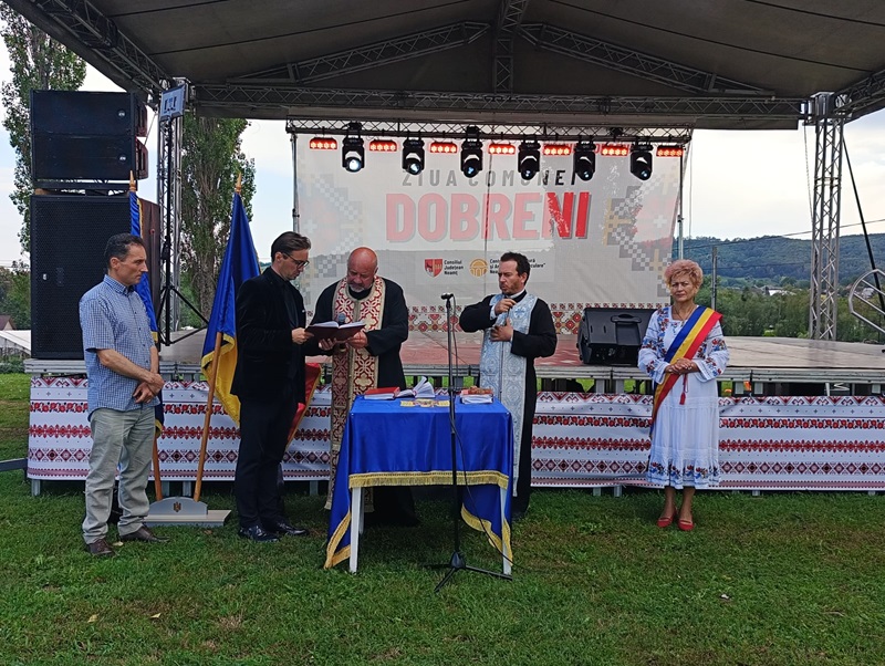 Bucuria de a sărbători împreună ziua așezării pe care o numesc ”acasă”, i-a adunat duminică (18 august), la stadion, pe locuitorii comunei Dobreni. Serbarea câmpenească a început cu o slujbă de mulțumire și binecuvântare, la finalul căreia preoții au cântat ”La mulți ani!”, după un scurt discurs: ”Bunul Dumnezeu să rânduiască cele frumoase în viața dumneavoastră! Românii știu foarte frumos să petreacă, în decență și cumințenie. Mulțumim lui Dumnezeu și Maicii Domnului pentru tot ce s-a întâmplat în ultimii ani în localitatea noastră!”.