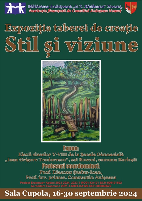 Biblioteca Județeană „G.T. Kirileanu“ Neamț găzduiește expoziția de pictură a taberei de creație intitulată „Stil și viziune“, în Sala Cupola, în perioada 16-30 septembrie 2024.