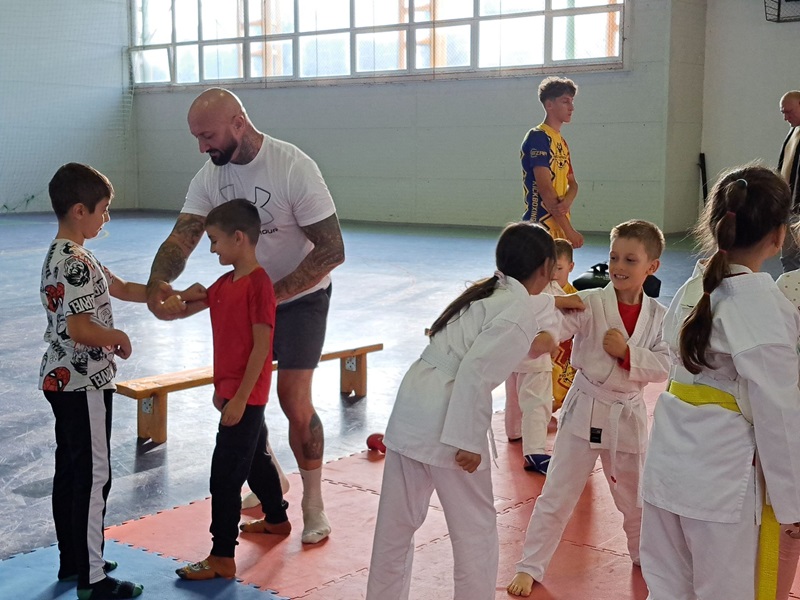 Participarea a fost liberă, astfel că și spectatorii care au dorit să experimenteze un curs de tehnici de luptă MMA au putut să se alăture sportivilor. Seara s-a încheiat cum altfel, decât cu o mulțime de poze și autografe! L-am întrebat pe John Smith cum de i-a venit ideea sa facă acest seminar în Hangu. „Îl cunosc pe Mihai de mulți ani, de când practica Kyokushin la clubul regretatului Dan Petre, dar știu că are și mai mulți ani de Shotokan în spate. Știam de clubul lui de karate, că face treabă la modul cel mai serios, la fel ca și noi. Inițial am vorbit să venim pentru sportivii lui, să facem un antrenament, să le povestim din perspectiva de luptători profesioniști si să arătăm niște tehnici de MMA ca un schimb de experiență. Apoi am zis de ce să nu facem cu ușile deschise, să participe oricine dorește, până la urmă toți ne dorim să promovăm sportul. Așa că am promovat seminarul, cam din scurt din păcate, dar data viitoare o să-l anunțăm mai din timp. A fost un antrenament foarte frumos, copiii extrem de receptivi, deși le simțeam emoțiile puternice. Ne-au impresionat și demonstrațiile susținute de ei, au fost foarte serioși și se vede că sunt foarte bine antrenați, disciplinați. Per total, o experiență foarte frumoasă pentru noi toți„.