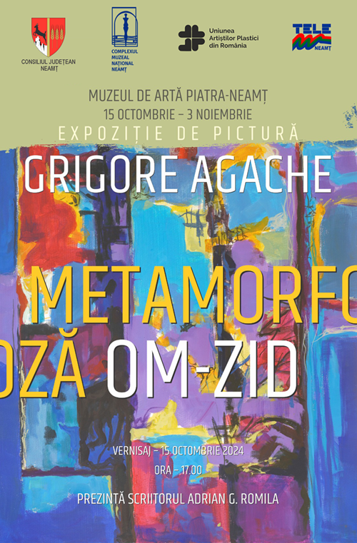 Muzeul de Artă Piatra-Neamţ organizează în perioada 15 octombrie – 3 noiembrie 2024, expoziţia de pictură „Metamorfoză – Om – Zid”, realizată de pictorul nemțean Grigore Agache. Evenimentul va avea deschiderea marți 15 octombrie, ora 17.00.