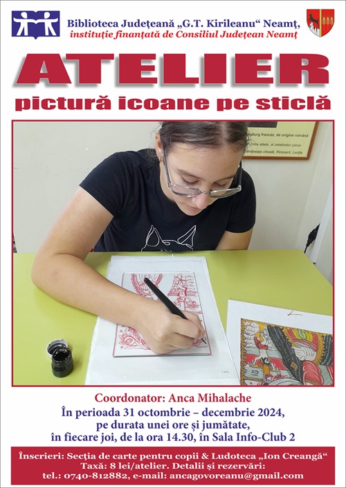 Biblioteca Județeană „G.T. Kirileanu“ Neamț organizează un nou atelier pentru învățarea tehnicii de pictare a icoanelor pe sticlă, coordonat de Anca Mihalache, în perioada octombrie – decembrie 2024. Atelierul se adresează copiilor cu vârsta între 9 și 14 ani și se va desfășura săptămânal, începând cu data de 31 octombrie, pe durata unei ore și jumătate, în fiecare joi, de la ora 14.30, în Sala Info-Club 2.