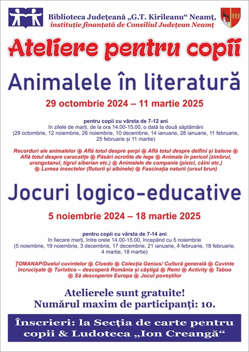Biblioteca Județeană „G.T. Kirileanu“ Neamț organizează două serii de ateliere pentru copii începând cu data de 29 octombrie anul acesta și până în luna martie a anului 2025.