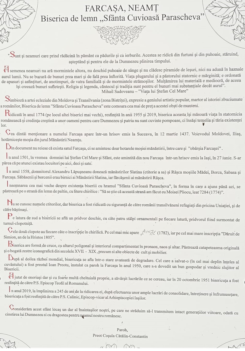 Unul dintre cele mai frumoase și bine conservate monumente istorice din județul Neamț, de mare valoare arhitecturală și artistică, este biserica Sfânta Cuvioasă Parascheva din Farcașa. De aproape 20 de ani, lăcașul de cult se află în grija părintelui Cătălin Coșula, care se consideră privilegiat să aibă o asemenea misiune.