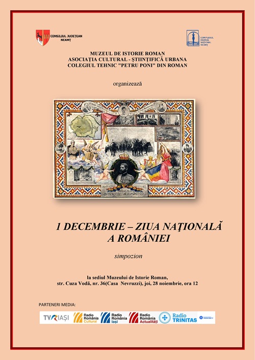 Joi, 28 noiembrie 2024, de la ora 12.00, la sediul Muzeului de Istorie Roman, str. Cuza Vodă, nr. 36 (Casa Nevruzzi) va avea loc simpozionul ” 1 Decembrie – Ziua Naţională a României”. Activitatea se adresează publicului tânăr, din ciclul liceal, fiind realizată în colaborare cu Colegiul Tehnic „Petru Poni” din Roman.